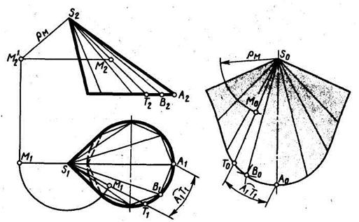 Развертка конической поверхности выполняется аналогично развертке пирамиды в следующем порядке. Сначала в заданный конус вписывают n -угольную пирамиду (число п, зависящее от размеров и масштаба чертежа, следует брать в пределах от 8 до 12). Затем строят развертку боковой поверхности вписанной пирамиды. Соединив концы ребер плавной кривой, получают приближенную, развертку боковой поверхности конуса.