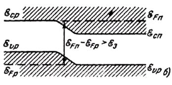 Излучение в полупроводниках характеризуется тем, что в процессе лазерного усиления принимают участие не два энергетических уровня, а две зоны с конечным количеством уровней: зона проводимости и валентная зона. При этом испускание фотона произойдет только тогда, когда в зоне проводимости имеется электрон, а в валентной зоне — одновременно и дырка. При термодинамическом равновесии распределение электронов в зоне проводимости и в валентной зоне описывается функцией Ферми — Дирака