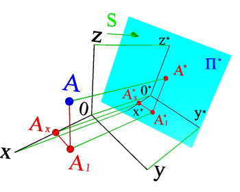 На рисунке 92 показана точка А, отнесенная к системе прямоугольных координат xyz. Вектор S определяет направление проецирования на плоскость проекций П*.
