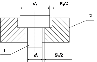 Предположим, в сборке имеются ступенчатый валик 1 и отверстие 2. Для собираемости этих деталей необходимо обеспечить наличие зазора по диаметрам d1 и d2 - s1 и s2 (Рис.74) .