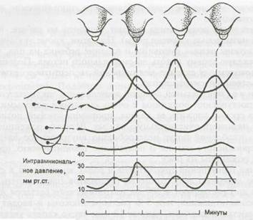 Вершины кривых сокращений маточной мускулатуры, записанные из разных отделов матки, не совпадают (по Кальдейро—Барсиа).