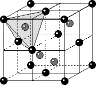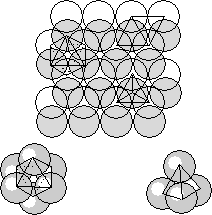 Несмотря на то, что шары максимально плотно прилегают друг к другу между ними все же остаются треугольные пустоты -«лунки». Следующий слой по условиям плотнейшей упаковки должен помещаться в лунках предыдущего. Однако, мы не можем разместить шары следующего слоя во все лунках, так как их в 2 раза больше чем частиц. Заполненной окажется только половина. Теперь между шарами разных слоев определились объемные пустоты. Из рисунка видно, что пустоты относятся к двум различным типам. Одни сквозные и окружены 6 шариками, а другие несквозные и окружены 4 шариками. При ближайшем рассмотрении видно, что центры шаров, окружающих пустоты первого типа расположены по вершинам октаэдра (октаэдрические пустоты), а шаров, окружающих пустоты второго типа – по вершинам тетраэдра (тетраэдрические пустоты). Тетраэдрические пустоты имеют меньшие размеры, чем октаэдрические.