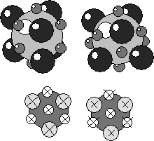 Пустоты играют важную роль в понимании построения структур сложных кристаллов на базе ПУ. В пустотах могут располагаться частицы другого сорта обладающие меньшим размером. Иными словами, не нарушая ПУ можно построить структуры соединений, состоящих частиц разного сорта. Расположение пустот и их количество строго закономерны. Различие между ПГУ и ПКУ в относительном расположении пустот показано на рисунке. В ПГУ тетраэдрические пустоты лежат над тетраэдрическими, а октаэдрические – над октаэдрическими. В ПКУ тетраэдрические пустоты расположены над октаэдрическими. В обеих упаковках над и под частицей находятся тетраэдрические пустоты. Таким образом, одну частицу любой ПУ окружают 6 октаэдрических и 8 тетраэдрических пустот. Так как каждая пустота формируется 6 или 4 частицами, легко посчитать, что на одну частицу ПУ приходится (