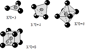 При рассмотрении гомоатомных структур, например золота или алмаза берут одноименные частицы, а при рассмотрении гетероатомных структур – частицы разного знака. В зависимости от количества частицы образуют группировки различной формы. Так для КЧ=3 частицы будут занимать вершины треугольника и группировка будет иметь форму треугольника, при КЧ=4 – тетраэдра, КЧ=6 – октаэдра, КЧ=8 – куба и так далее.