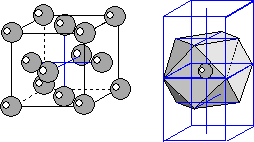 3) Структуры самородных Cu, Ag, Au, Pt. В основе структур этих самородных металлов лежит F-кубическая решетка Бравэ. Однако, учитывая, что все частицы имеют одинаковый размер, структуры этих минералов следует рассматривать как ПКУ. Совместив две ЭЯ видим, что один атом металла окружен 12 соседними атомами, это максимальное возможное количество координационных соседей. Координационный полиэдр имеет форму кубоктаэдра. КЧ=12.