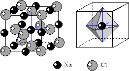 4) Структура галита NaCl. Строится на базе F-решеток Na и Cl, вдвинутых друг в друга на 1/2 диагонали. Разница ионных радиусов Na и Cl настолько велика, что Cl образует ПКУ, а Na заполняет октаэдрические пустоты. Из формулы видно, что Na занимает все октаэдрические пустоты. КЧNa=6, КЧCl=6. Координационные полиэдры –октаэдры.