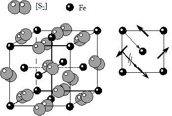 5) Структура пирита FeS2. Структура пирита производная от структуры галита. Только вместо Na необходимо поместить гантельки серы, а вместо Cl – ионы Fe. В структуре пирита присутствует необычный элемент – гантелевидная пара атомов серы. Гантели серы не имеют сферической симметрии и ориентированы строго определенным образом, под углом к ребрам решетки. В результате теряется диагональная трансляция и приходится рассматривать структуру пирита на базе Р - решетки Бравэ. Более того, расположение гантелей серы приводит к исчезновению диагональных плоскостей симметрии, что понижает симметрию минерала с планаксиальной у галита до центральной у пирита. КЧFe=6. В качестве вершин полиэдра рассматриваются центры тяжести гантелей.
