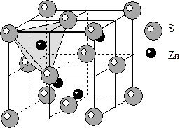 7) Структура сфалерита ZnS. Так же как и у структуры галита из-за разницы размеров ионов S и Zn сера слагает ПКУ, в тетраэдрических пустотах которой расположены атомы цинка. Из формулы понятно, что цинк занимает только половину тетраэдрических пустот, а остальные остаются незанятыми. КЧZn=4, КЧS=4. Координационные полиэдры тетраэдры. Так как частицы в структуре двух сортов, отсутствуют координатные плоскости скользящего отражения типа d, имеющиеся в аналогичной структуре алмаза, что приводит к понижению симметрии до планального вида кубической сингонии. Федоровская группа F