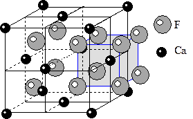 8) Структура типа флюорита CaF2. В отличие от рассмотренных структур соотношение радиусов катиона и аниона (RCa=1.06Е, RF=1.33Е) не позволяет расположить анионы в плотнейшую упаковку. Однако такое соотношение радиусов позволяет нам рассматривать ионы Ca расположенные по мотиву плотнейшей упаковки или в соответствии с F - решеткой Бравэ, все тетраэдрические пустоты которой заняты ионами F. То есть противоположно тому, как мы рассматривали все предыдущие структуры. Благодаря этой возможности структуры типа флюорита называются антиструктурами. КЧCa=8, КЧF=4. Соответственно КП для фтора – тетраэдр, а для кальция – куб. Структуру типа флюорита имеет минерал уранинит (UO2), также содержащий катион очень большого радиуса.