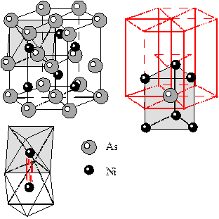 10) Структура никелина NiAs. В структуре никелина ионы мышьяка образуют ПГУ, во всех октаэдрических пустотах которых расположены ионы Ni. Таким образом, КЧNi=6 и КП у него октаэдр. Ионы As окружены 6 ионами Ni (КЧAs=6), располагающимися в вершинах тригональных призм. Соседние октаэдры никеля имеют общую грань, таким образом, расстояние между атомами металла минимальное возможное. В результате такого расположения атомов никеля между ними возникает слабая металлическая связь. Такие соединения называют кластерными. Структуру типа никелина имеет пирротин Fe1-xS.
