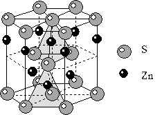 11) Структура вюртцита ZnS. Строится на базе ПГУ атомов серы. Цинк занимает половину тетраэдрических пустот. КЧZn=4, полиэдр – тетраэдр. КЧS=4, полиэдр – тетраэдр.