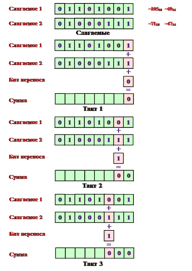 Пример сложения двух чисел в параллельном сумматоре по этапам (тактам) приведен на рисунках 2.5.17а и 2.5.17в. (для суммирования выбраны те же числа, что и в примере с последовательным сумматором).