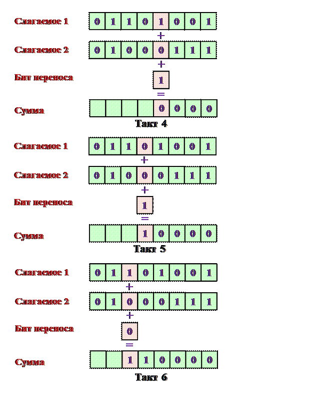 Рис. 1.2.16б. Такты суммирования 4-6 в последовательном сумматоре