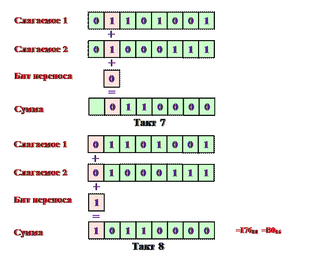 Рис. 1.2.16в. Такты суммирования 7-8 в последовательном сумматоре