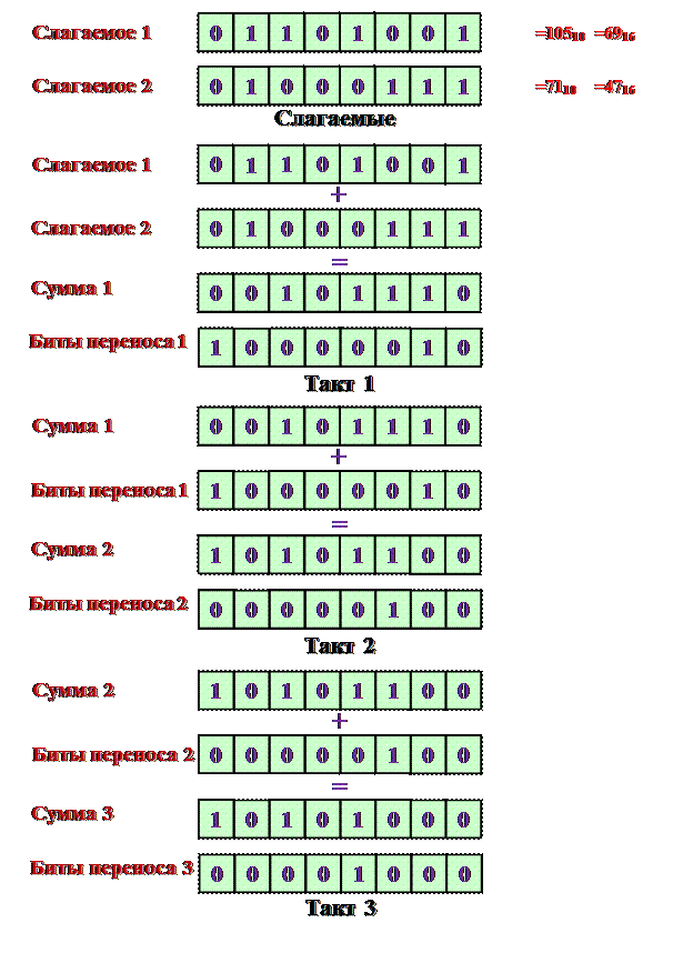Рис. 1.2.17а. Слагаемые и такты суммирования 1-3 в параллельном сумматоре