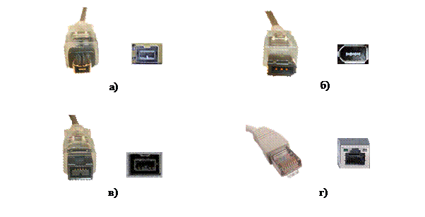 Для шиныIEEE 1394 без подачи электропитания используется 4-контактный разъем FireWire (рис. 1.3.6а), а с подачей электропитания (30 В) – 6-контактный разъем (рис. 1.3.6б). Для шины, соответствующей спецификации IEEE 1394b, используется 9-контактный разъем FireWire, называемый Beta-разъемом. Кроме этого, для соединения 9-проводного кабеля с 6-проводным кабелем используются Bilingual-разъемы («двуязычные» разъемы). Разъемы для соединения двух 6-проводных кабелей получили в спецификации 1394b название Legacy-разъемов («унаследованных» разъемов). Существуют также кабели, соединяющие устройство с Legacy-разъемом и устройство с разъемом i.Link. Для обмена данными по витой паре используется разъем RJ-45 (рис. 1.3.6г).