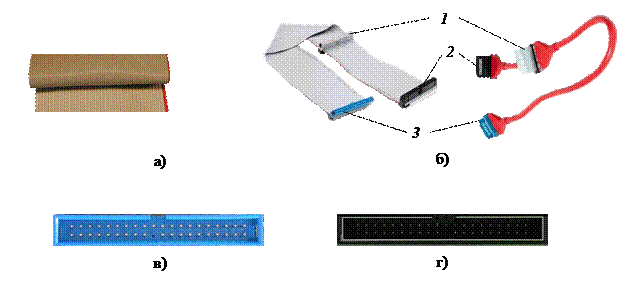 Рис. 1.3.7. Интерфейс IDE (ATA): а) сравнение 80-разрядного кабеля (сверху) и 40-разрядного кабеля (снизу); б) подключение шинного и круглого кабеля (1 – к вторичному устройству; 2 – к первичному устройству; 3 – к материнской плате или контроллеру)