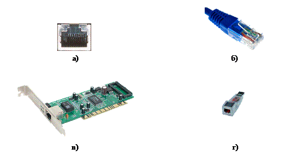 Рис.?????. Компьютерные компоненты Ethernet: а) гнездо порта Ethernet на материнской плате; б) разъем кабеля Ethernet; в) адаптер Ethernet; г) адаптер USB-Ethernet
