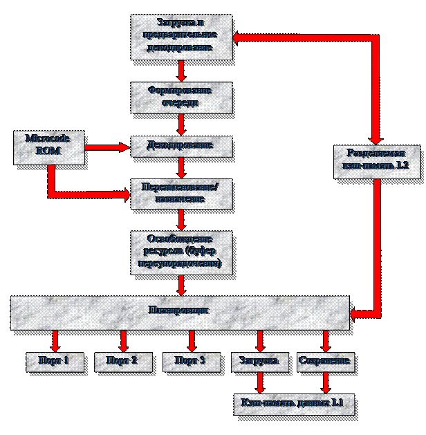 Узел освобождения ресурсов (буфер переупорядочения) совмещает функции диспетчеризации ресурсов узла ядра, т.е. наличие данных и ресурсов для их выполнения, а также станции резервирования и узла освобождения ресурсов в архитектуре NetBurst.