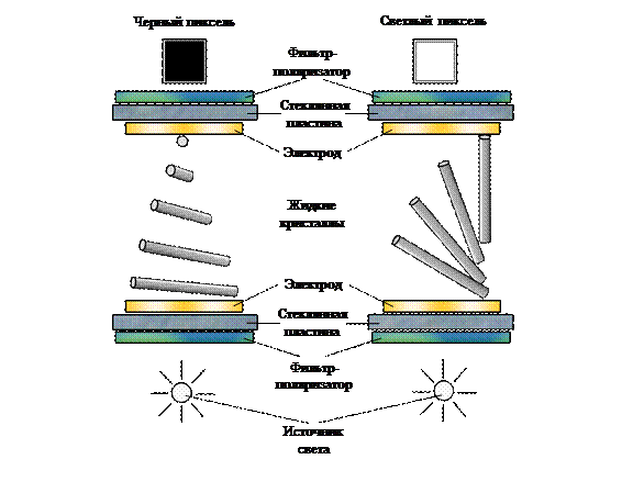 Изменение интенсивности проходящего через LCD-монитор светового потока от черного до белого достигается с помощью использования явления поляризации света (см. 1.3.5.3.1).