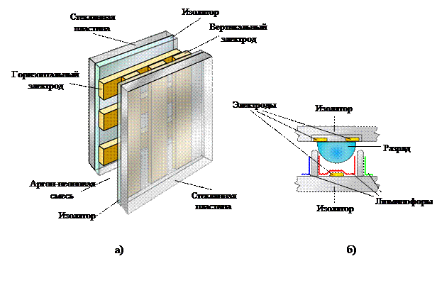 Рис. 1.3.40. Плазменный монитор: а) структура экрана; б) разряд в ячейке