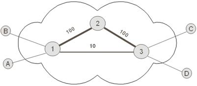 Решение было найдено путем минимизации критерия, в качестве которого в данном примере выступала длина маршрута, измеренная количеством транзитных узлов. Однако, возможно, наш выбор был не самым лучшим. На рисунке показано, что каналы 1-2 и 2-3 обладают пропускной способностью 100 Мбит/с, а канал 1-3 – только 10 Мбит/с. Если мы хотим, чтобы наша информация передавалась по сети с максимально возможной скоростью, то нам следовало бы выбрать маршрут А-1-2-3-С, хотя он и проходит через большее количество промежуточных узлов. То есть можно сказать, что маршрут А-1-2-3-С в данном случае оказывается «более коротким».