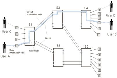 Чтобы объяснить основную идею коммутации каналов, рассмотрим ее в максимально упрощенном виде. Как показано на рис., коммутационная сеть состоит из коммутаторов (S1, S2, …, S5), связанных между собой линиями связи. Каждая линия имеет одну и ту же пропускную способность.