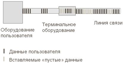 Каждый абонент подключается к сети с помощью терминального устройства (Т), которое посылает в сеть данные с постоянной скоростью, причем этаскорость в точности равна пропускной способности линий. Если в какие-то периоды времени у абонента скорость информации, которую он хочет передать в сеть, оказывается меньше пропускной способности линии, то терминальное устройство продолжает питать сеть постоянным потоком данных, дополняя полезную информацию пользователя "пустыми" (незначащими) данными (см. рис.).