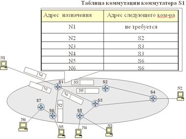Решение о продвижении пакета принимается на основе таблицы коммутации, содержащей набор адресов назначения и адресную информацию, однозначно определяющую следующий по маршруту (транзитный или конечный) узел.