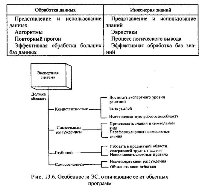 Экспертные системы и системы искусственного интеллекта отличаются от систем обработки данных тем, что в них в основном используются символьный (а не числовой) способ представления, символьный вывод и эвристический поиск решения (а не исполнение известного алгоритма).