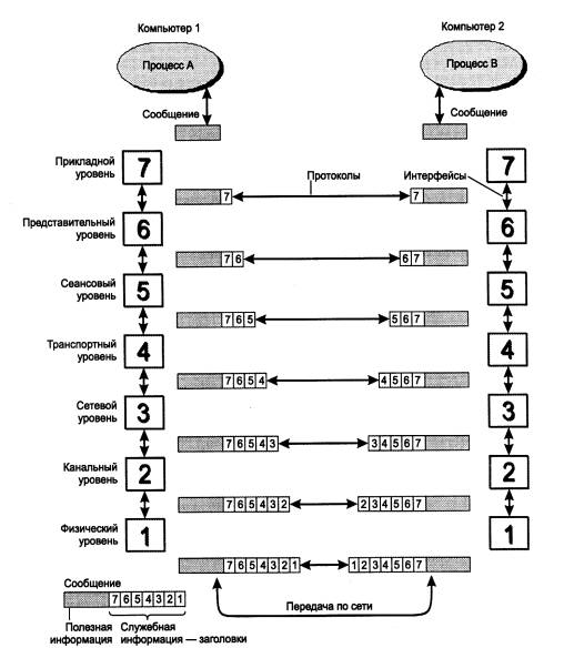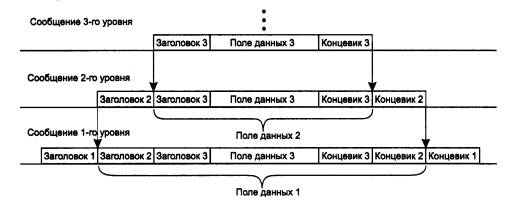 После формирования сообщения прикладной уровень направляет его вниз по стеку представительному уровню. Протокол представительного уровня на основании информации, полученной из заголовка прикладного уровня, выполняет требуемые действия и добавляет к сообщению собственную служебную информацию - заголовок представительного уровня, в котором содержатся указания для протокола представительного уровня машины-адресата. Полученное в результате сообщение передается вниз сеансовому уровню, который в свою очередь добавляет свой заголовок, и т. д. (Некоторые реализации протоколов помещают служебную информацию не только в начале сообщения в виде заголовка, но и в конце, в виде так называемого «концевика».) Наконец, сообщение достигает нижнего, физического уровня, который собственно и передает его по линиям связи машине-адресату. К этому моменту сообщение «обрастает» заголовками всех уровней (рис. 25).