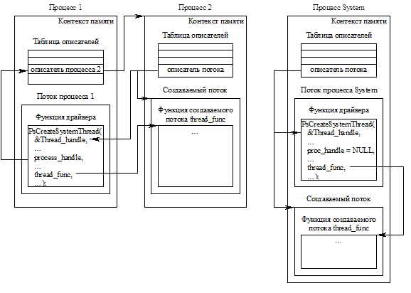 Существует простейший способ решения этой проблемы, основанный на том факте, что функция – точка входа в драйвер DriverEntry всегда вызывается в контексте потока System. Вызов функции PsCreateSystemThread() следует производить из DriverEntry, и при этом указывать создавать поток в контексте процесса System. Получив описатель созданного потока, можно получить указатель на объект-поток с помощью ObReferenceObjectByHandle(), и в дальнейшем пользоваться этим указателем в контексте любого процесса и потока. При завершении использования объекта-потока обязательно освободить его с помощью вызова ObDereferenceObject(). Все вышесказанное иллюстрируется рисунком 1.
