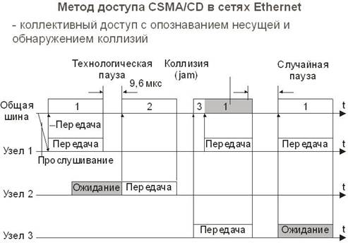 Метод доступа, используемый в сетях Ethernet на разделяемой проводной среде, носит название CSMA/CD (Carrier Sense Multiple Access with Collision Detection – прослушивание несущей частоты с множественным доступом и распознаванием коллизий). Название метода доступа достаточно хорошо описывает его особенности.