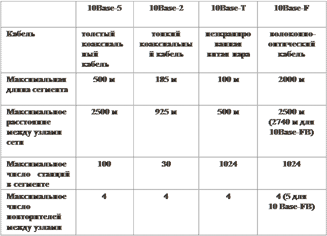 В таблице приведены параметры наиболее популярных спецификаций физической среды Ethernet для скорости передачи данных 10 Мбит/c