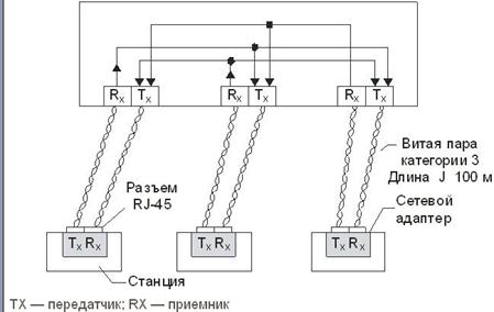 Устройство такого концентратора приведено на рис. Каждый сетевой адаптер соединяется с концентратором двумя витыми парами. Одна витая пара требуется для передачи данных от станции к концентратору (выход TX сетевого адаптера), другая – для передачи данных от повторителя к станции (вход RX сетевого адаптера). Концентратор побитно принимает сигналы от одного из конечных узлов и синхронно передает их на все свои остальные порты, исключая тот, с которого поступили сигналы, одновременно улучшая их электрические характеристики.