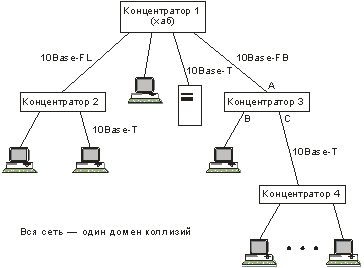 Добавление каждого концентратора изменяет физическую структуру, но оставляет без изменения логическую структуру сети. То есть независимо от числа концентраторов в сети сохраняется одна общая для всех интерфейсов разделяемая среда, так что передача кадра с любого интерфейса блокирует передатчики всех остальных интерфейсов.
