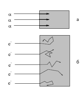 Прохождение электронов через вещество отличается от прохождения тяжёлых заряженных частиц. Главная причина - малая масса электрона. Это приводит к относительно большому изменению импульса электрона при каждом его столкновении с частицами среды, что вызывает заметное изменение направления движения электрона и как результат - электромагнитное радиационное излучение.