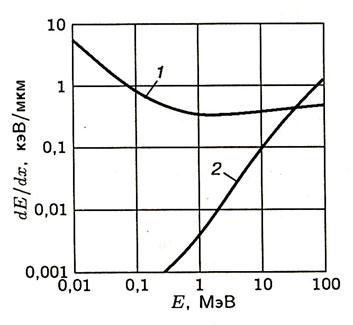 Рис. Удельные ионизационные (1) и радиационные (2) потери энергии электроном в кремнии