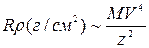 При более аккуратных расчетах не следует забывать, что в формуле Бете-Блоха есть еще коэффициенты, зависящие от среды: Z/A и I. Но для большинства веществ с малыми и средними A величина отношения Z/A~0,5 и очень медленно падает с увеличением A, а средний ионизационный потенциал I стоит под знаком логарифма, т.е. тоже слабо влияет на величину средних потерь энергии и, как следствие этого, на величину пробега.