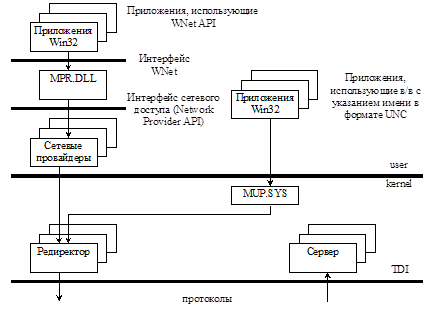 Встроенный редиректор NT реализован как драйвер файловой системы (rdr.sys), что дает возможность приложению обращаться к локальным и сетевым ресурсам одинаковым образом.