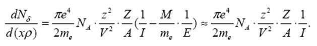 Из этой формулы видно, что число δ - электронов с энергией Тe, образованных в 1 г/см2 вещества релятивистской частицей, прямо пропорционально квадрату заряда частицы z2 и практически не зависит от характеристик среды, так как Z/A ≈ 0,5. Отсюда следует, что по плотности δ - электронов на треке частицы (например, в пузырьковой или фотоэмуль- сионной камере) можно определить заряд z релятивистской частицы.