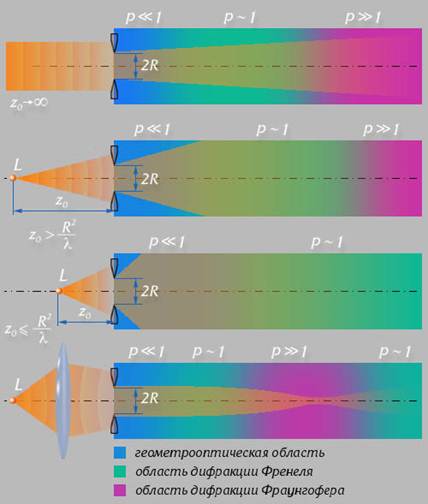 можно выделить три характерные области дифракции: геометрооптическую, дифракции Френеля и дифракции Фраунгофера.