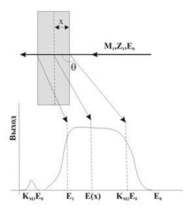 Аналитические возможности метода. Применение метода для определения пространственного распределения примесей и дефектов основано на возможности регистрировать разницу в энергии частиц ΔE, рассеянных атомами, находящимися на разной глубине. Частица, попадающая в детектор, претерпев акт упругого рассеяния на некоторой глубине x, имеет меньшую энергию, чем частица, рассеянная атомами вблизи поверхности. Это связано, во-первых, с потерями энергии на пути в мишень и из нее, а, во-вторых, из-за различий в потерях энергии при упругом взаимодействии частицы с атомами, находящимися на поверхности и на глубине x.