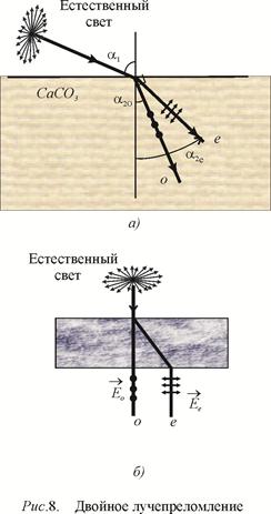 Необыкновенный пучок света не подчиняется обычному закону преломления и может отклоняться даже при нормальном падении света на кристалл (рис. 8 б).