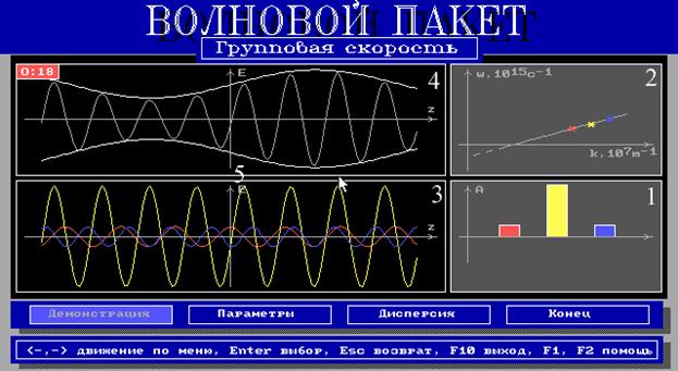 На рис.14 изображен общий вид экрана программы, предназначенной для изучения одновременного распространения в диспергирующей среде сигнала, содержащего три спектральных компоненты. Такая простая группа волн позволяет проиллюстрировать понятие групповой скорости и ее связь с фазовой скоростью. Используется линейный закон дисперсии. Программа позволяет изменять частоты (они указаны на графике в окне 2) и амплитуды всех трех спектральных компонент (окно 1), а также постоянные а и d в законе дисперсии (окно 2). Изменение параметров производится с помощью клавиши меню «Параметры». После нажатия клавиши «Старт» в окне 3 в динамическом режиме можно наблюдать движение всех трех волн в отдельности, а в окне 4 – движение всей группы волн в целом, то есть их суммы. Для удобства наблюдения на экран выведены специальные метки соответствующего цвета (5), которые показывают фазовые скорости спектральных компонент и отдельная метка белого цвета, показывающая групповую скорость.