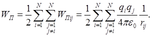 Каждый заряд взаимодействует попарно со всеми остальными зарядами системы. Энергия обладает свойством аддитивности. Поэтому полная энергия взаимодействия зарядов системы равна