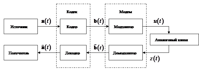 Преобразование дискретного сообщения в сигнал обычно осуществляется в виде двух операций – кодирования и модуляции. Кодирование представляет собой преобразование сообщения в последовательность кодовых символов, а модуляция – преобразование этих символов в сигналы, пригодные для передачи по каналу. С помощью кодирования и модуляции источник сообщений согласуется с каналом. В современных системах передачи дискретных сообщений различают две группы относительно самостоятельных устройств: кодеки и модемы. Кодеками называются устройства, преобразующие сообщение в код (кодер) и код в сообщение (декодер). Таким образом, кодер производит кодирование сообщения, а декодер – его декодирование. Как правило, кодер и декодер – логические устройства. Модемами называются устройства, преобразующие код в сигнал (модулятор) и сигнал в код (демодулятор).