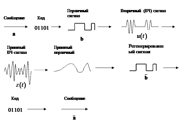 Рис. 1.4 иллюстрирует процесс преобразования дискретного сообщения в сигнал и сигнала в дискретное сообщение. Передаваемое дискретное сообщение образовано вектором