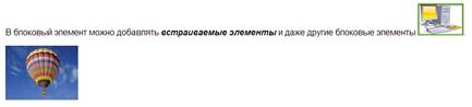 можно добавлять <span class="bi" id="sp1">встраиваемые элементы</span>и даже другие блоковые элементы