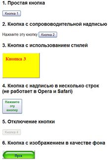 Для кнопки можно задать стили шрифта, текста, цвета и фона, а также стили полей, границ и отступов блоковой модели документа. Свойство vertical-align (вертикальное выравнивание надписи) для кнопок не действует, поскольку надписи всегда выровнены по середине. Свойство background-image (использование в кнопке изображения в качестве фона) не действует в Internet Explorer.